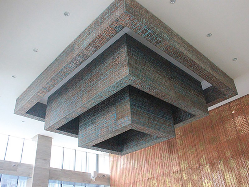 The large perforated Zipper curtain wall , using technical means to make the copper plate emit golden color and in the form of Chinese characters;The copper lamp belt consists of 2,014 pieces with raised surface ornamentation.